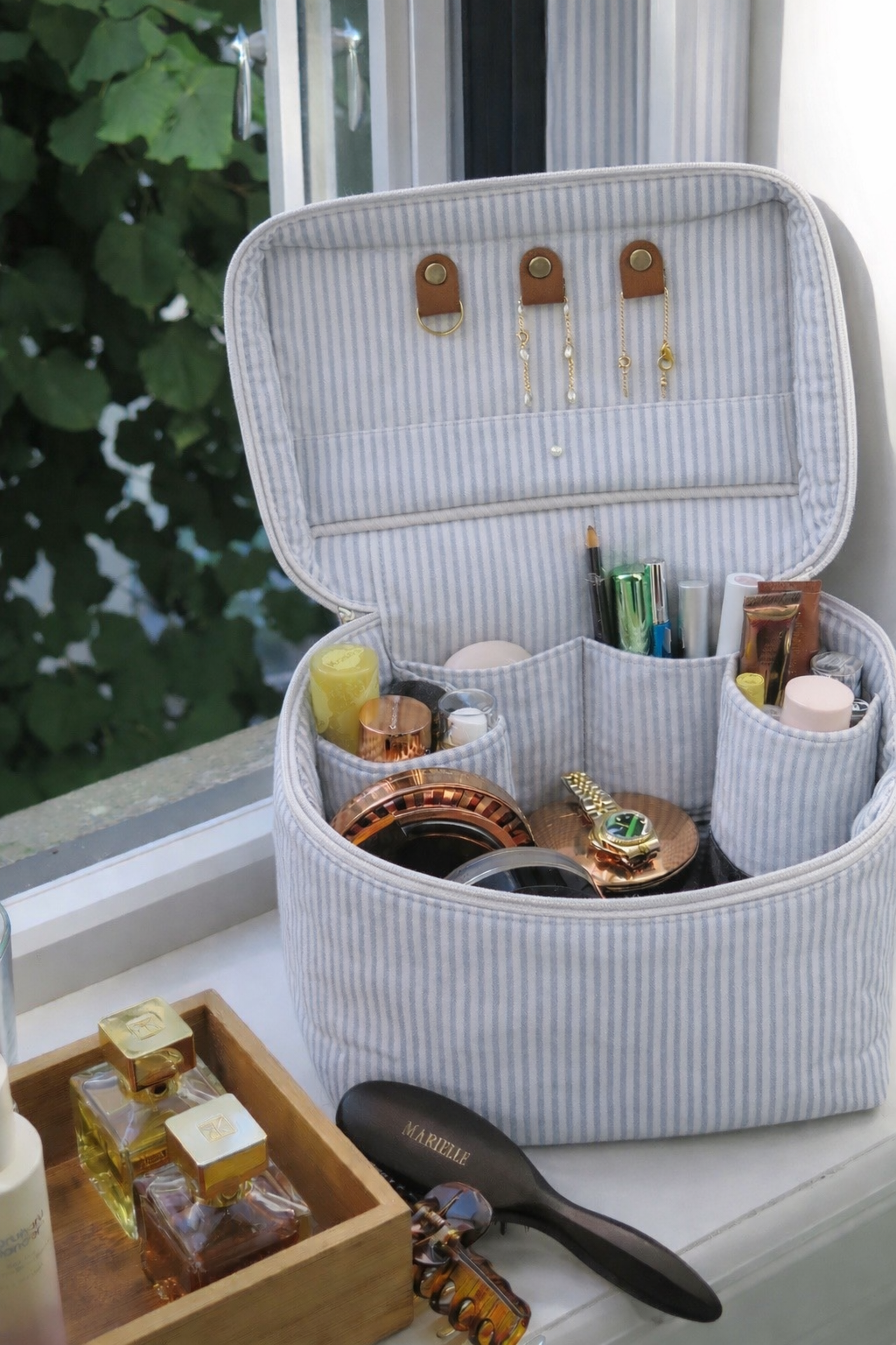 Crafted in timeless light blue striped fabric with elegant faux leather details, this spacious vanity travel case is designed to keep your makeup, skincare, jewelry, and beauty essentials neatly organized, whether at home or while traveling. The structured silhouette opens fully for easy access, while interior pockets and compartments keep everything in place.